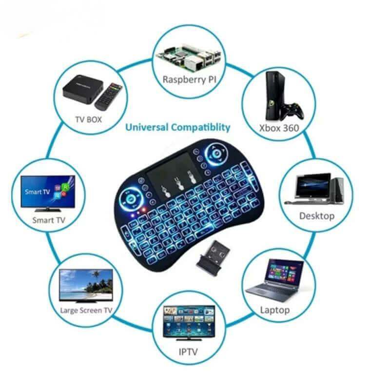 The Mini i8 2.4GHz wireless keyboard with touchpad combines sleek design, ergonomic comfort, and high performance. Its compact layout and built-in touchpad make it ideal for daily entertainment, gaming, and multimedia control. The keyboard features 3-color adjustable backlighting, allowing soft illumination for nighttime use without straining your eyes.